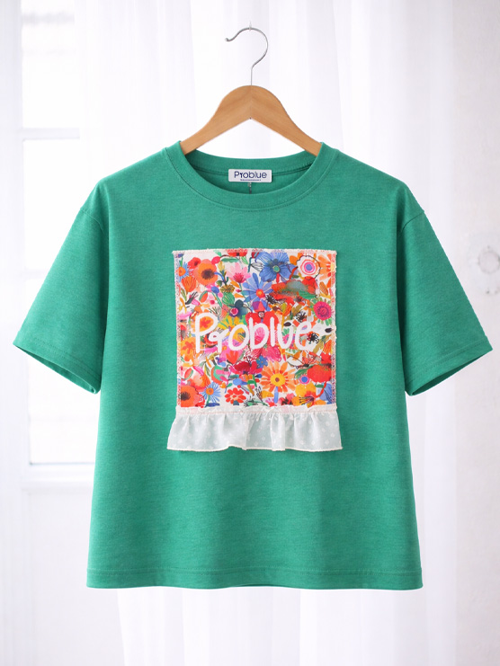 Camiseta Amapola con estampado exclusivo y colores muy primaverales con camiseta en verde hoja.