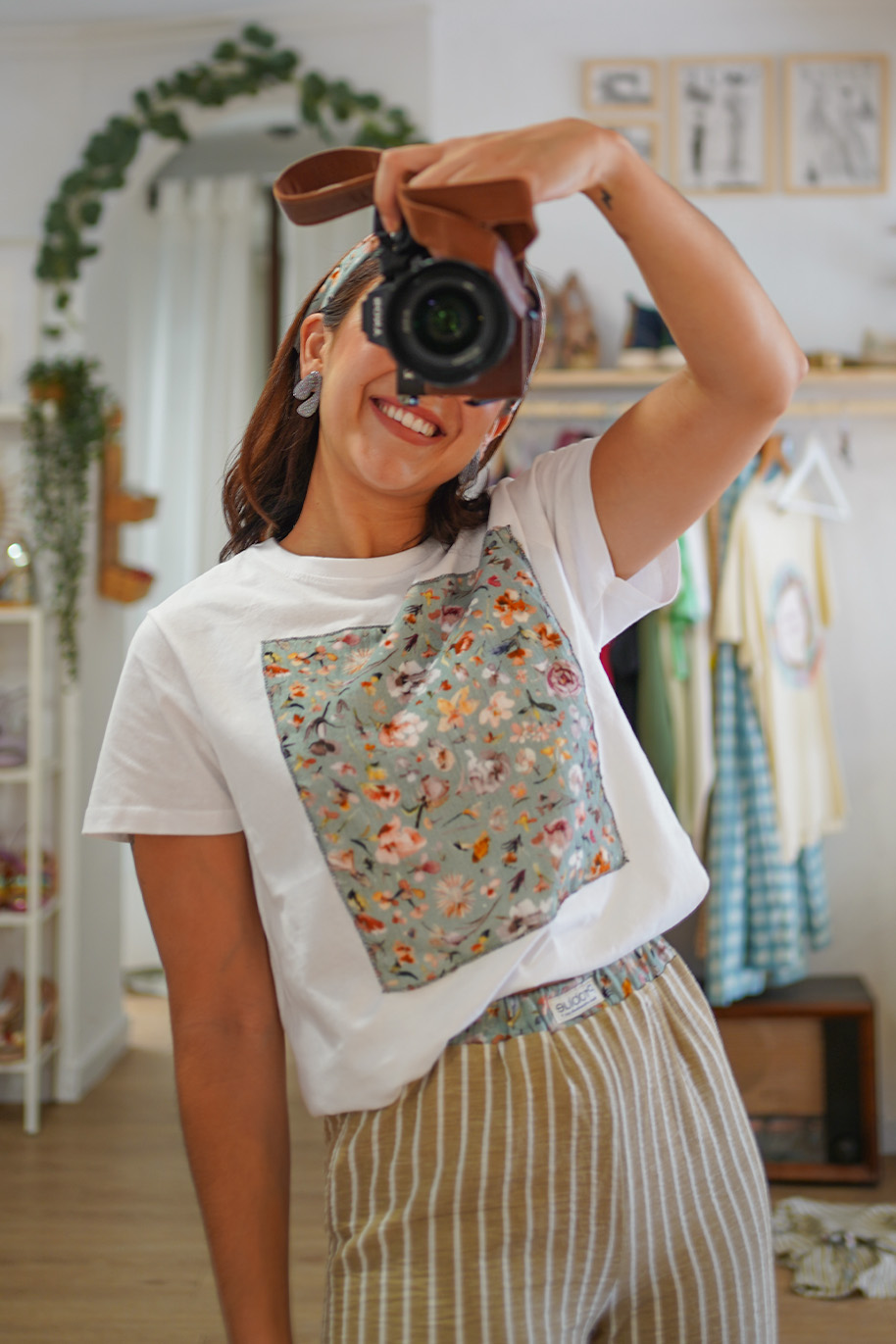 Está hecha con tejido 100% algodón y presenta un precioso estampado en tonos pastel, con toques de celeste y marrón, que la hace delicada y especial.