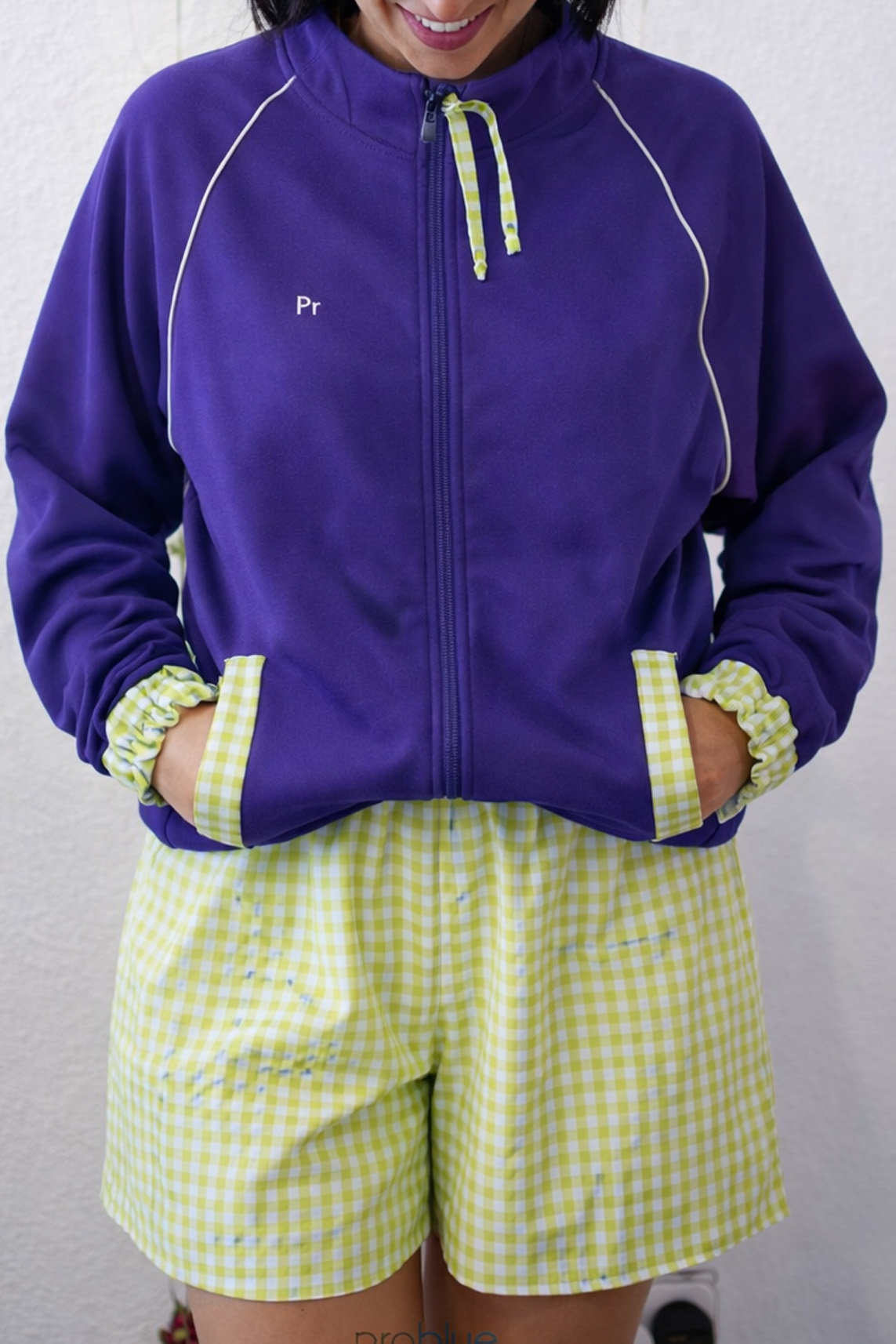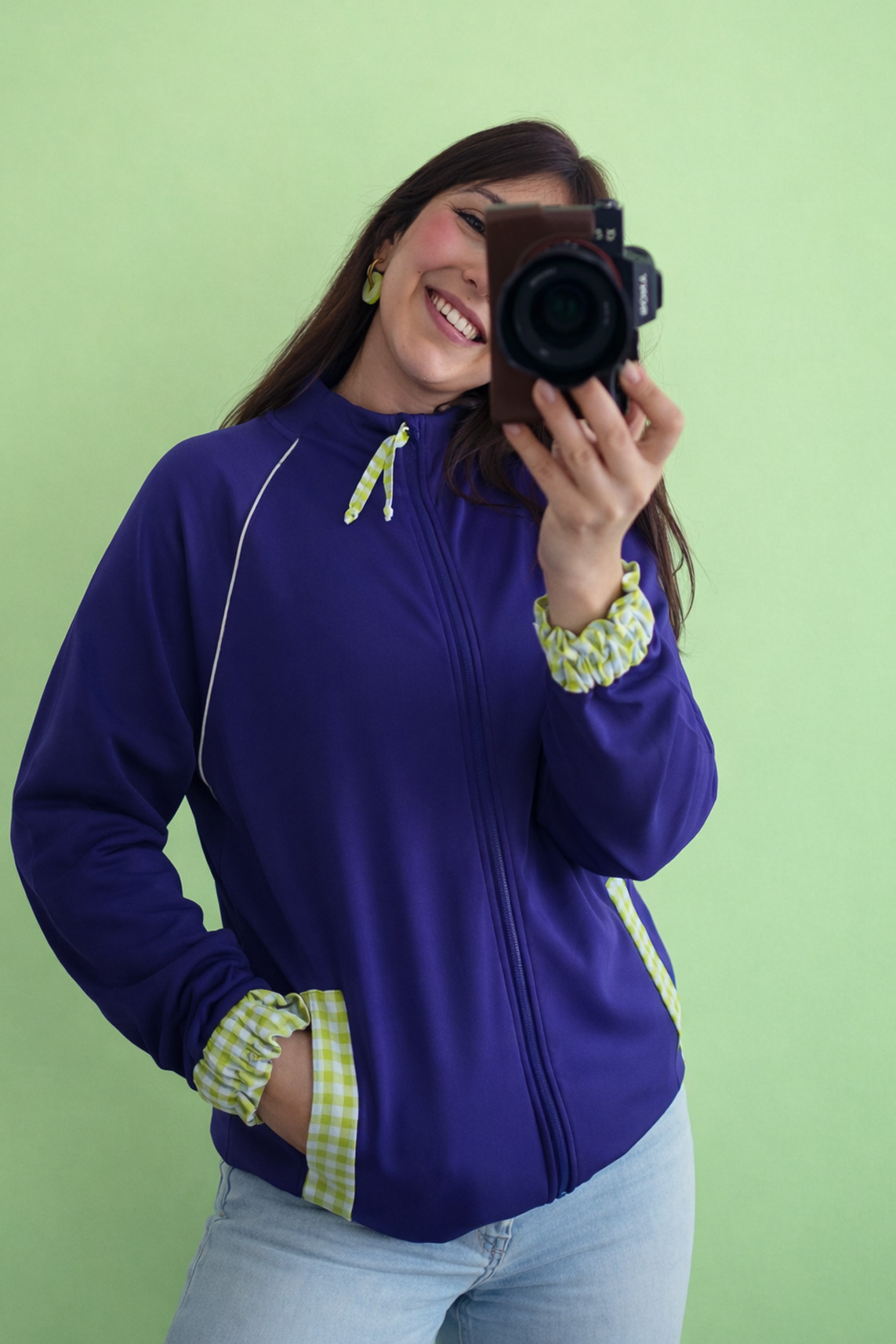 Chaqueta Tiedra, confeccionada en tejido sport negro, una prenda cómoda y versátil pensada para el día a día sin renunciar al estilo. Destaca por sus delicados detalles en vichy lima en los bolsillos, cuello y puños, que aportan un contraste fresco y femenino que realza su estética deportiva.