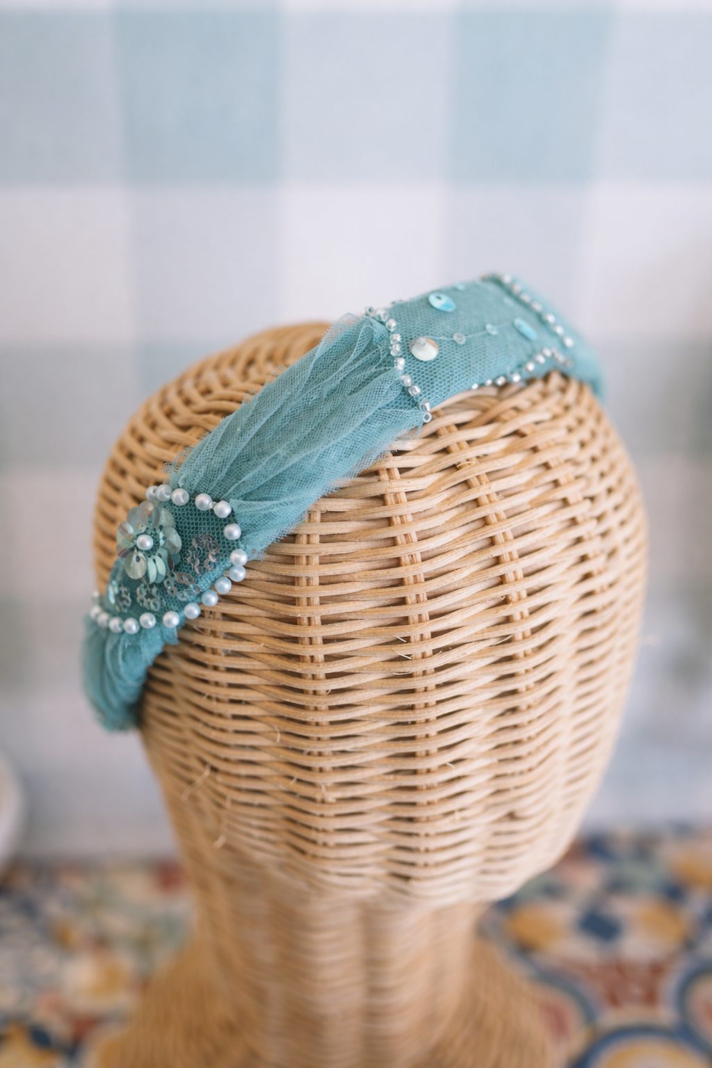 Hecha a mano con un tejido bordado muy especial, esta diadema tiene una base en celeste empolvado y está decorada con piedras tipo joya que le dan un brillo único.