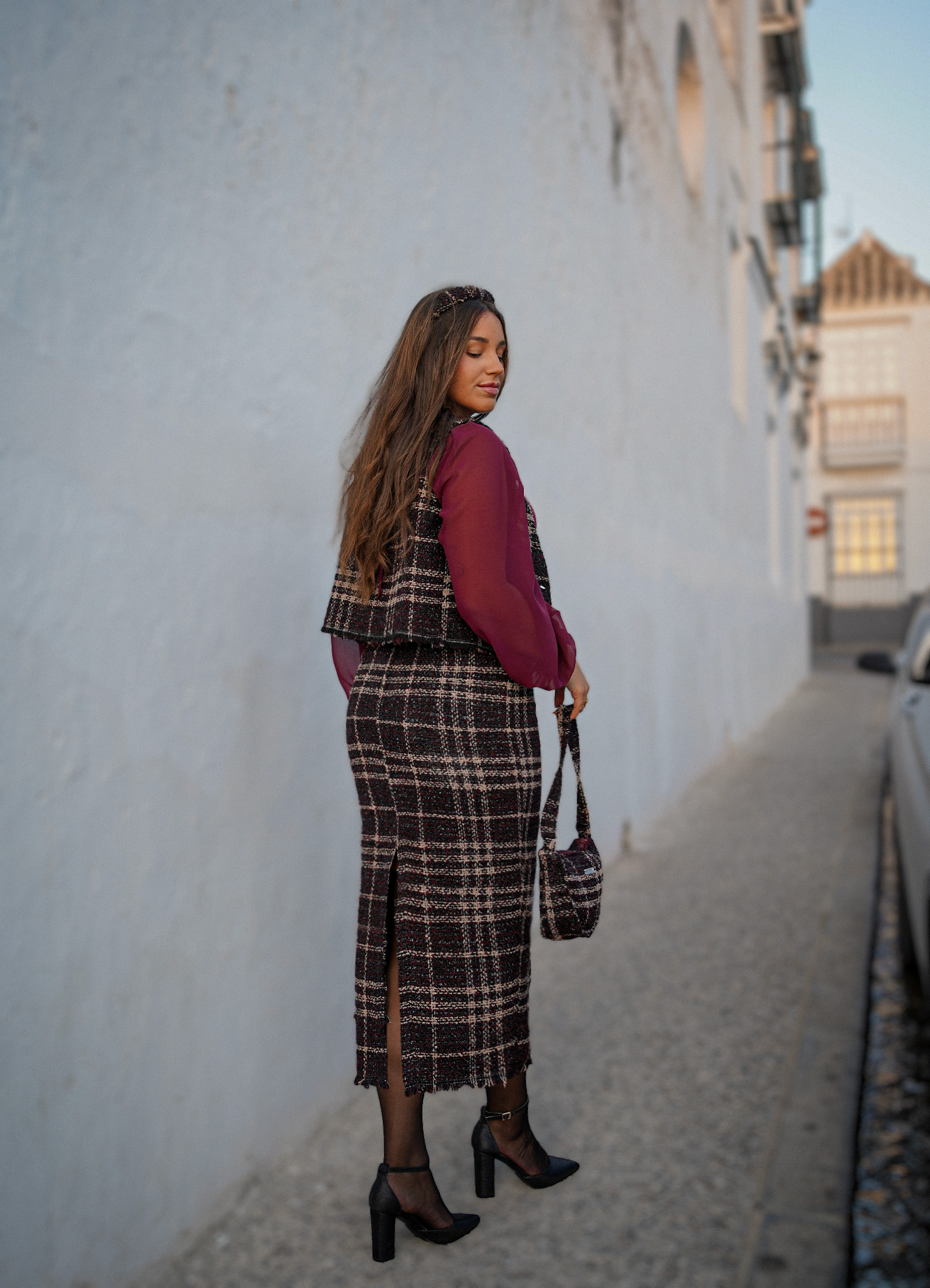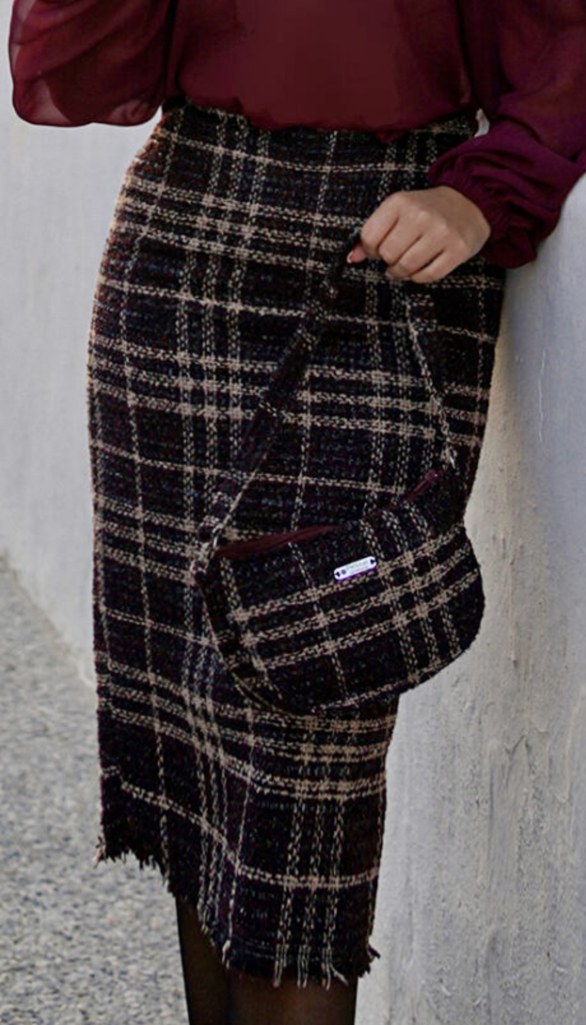 Confeccionada en tweed negro con brillo y detalles en berenjena y beige, su largo midi, forro interior y cierre invisible la convierten en una prenda cómoda y sofisticada.