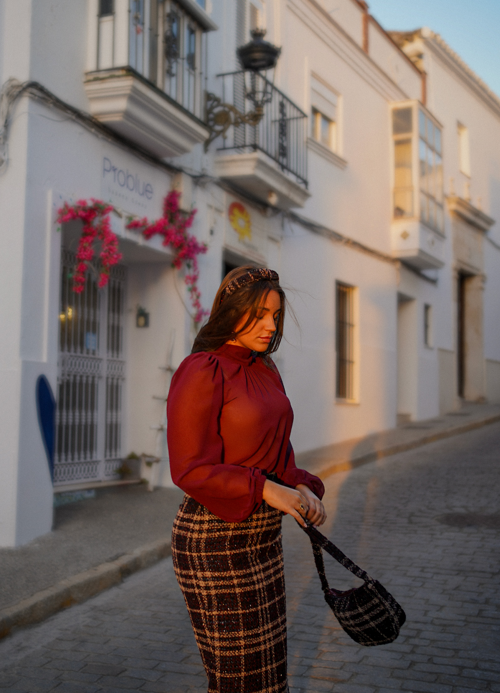 Paleta de colores: tonos oscuros, berenjena, beige y negro.