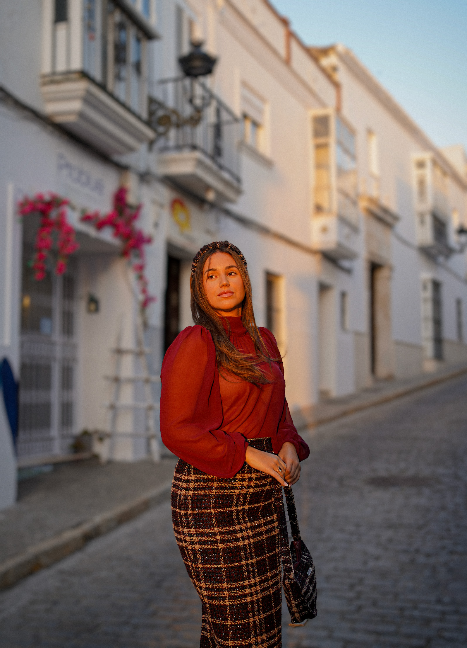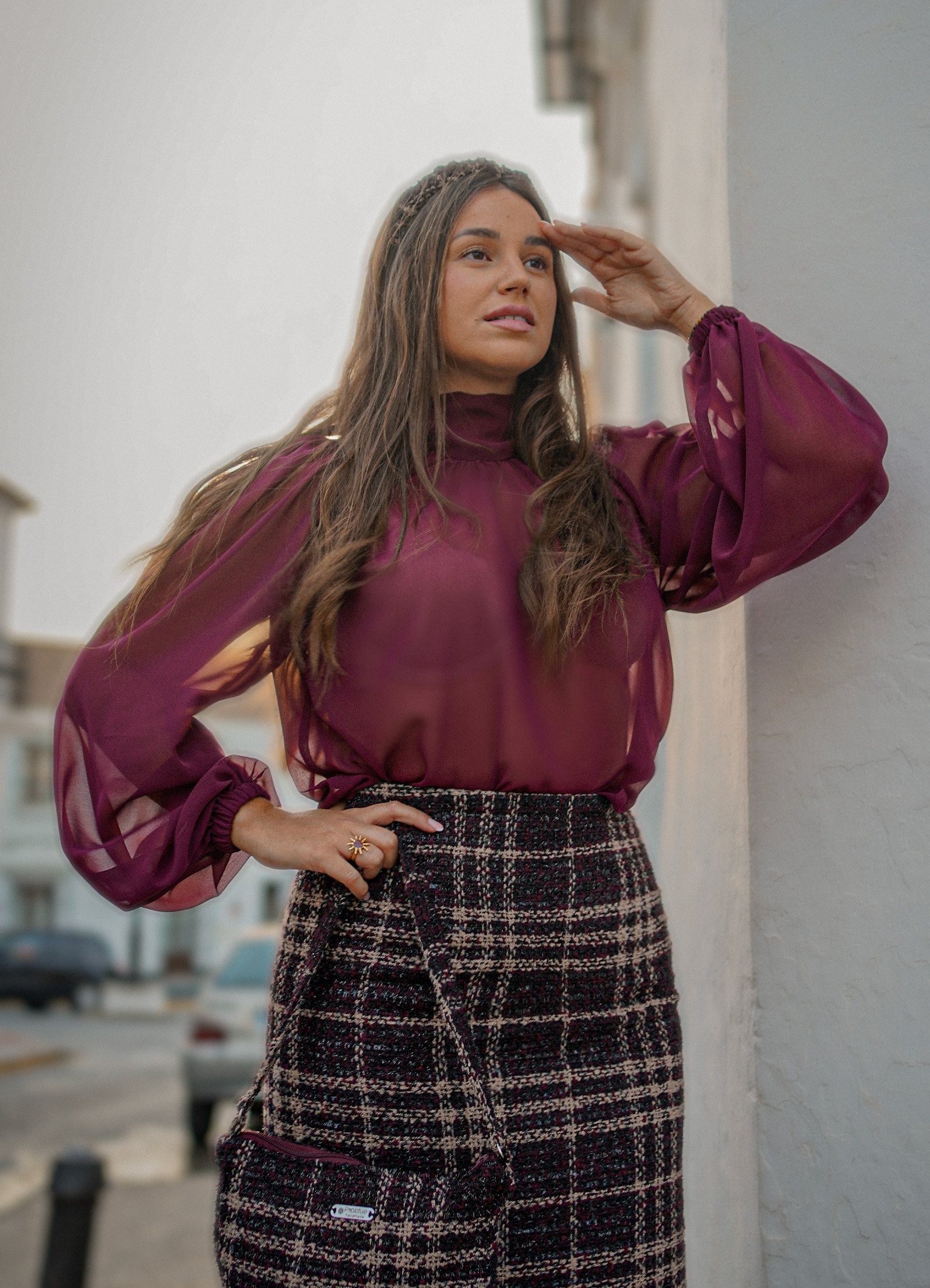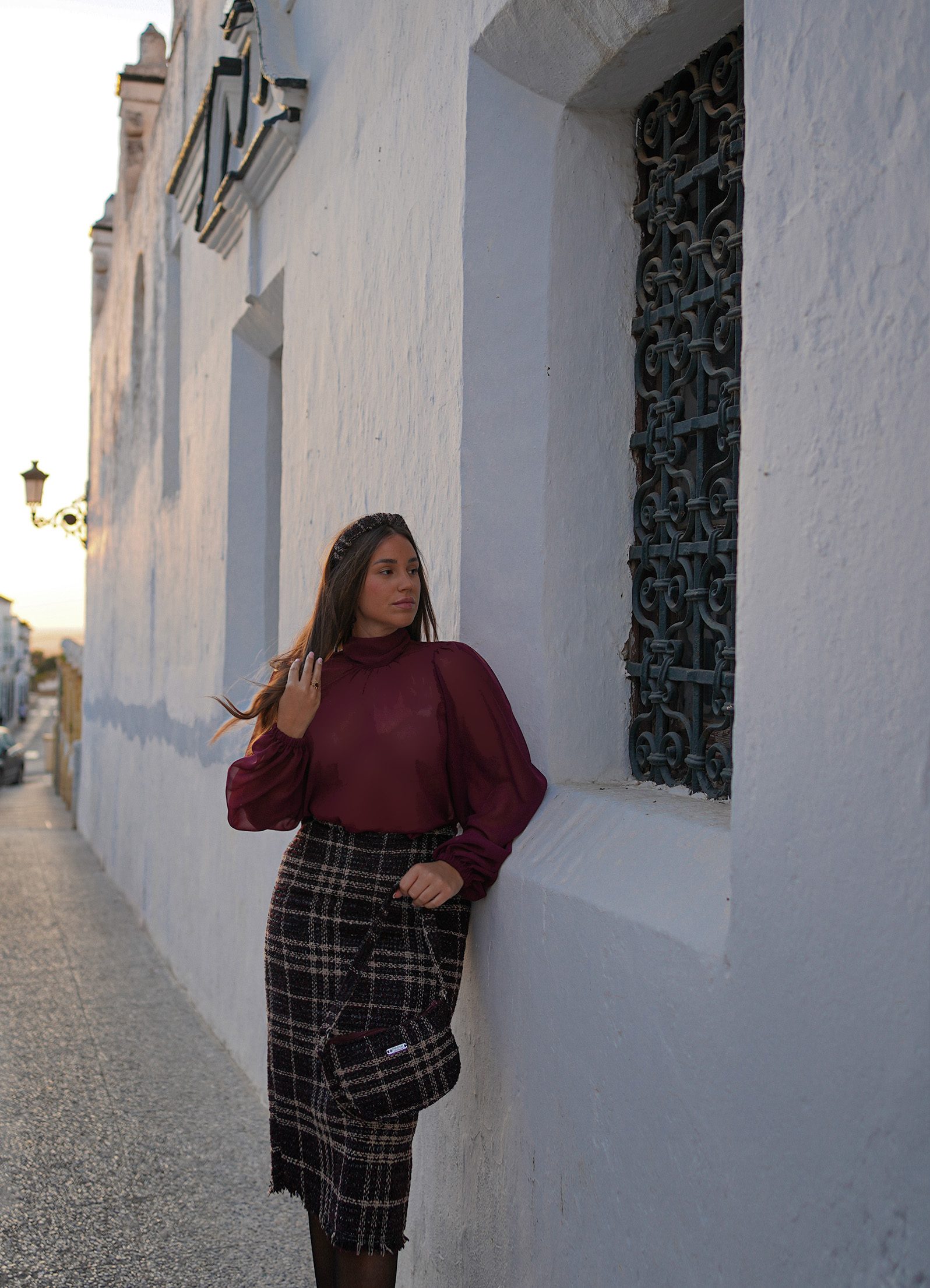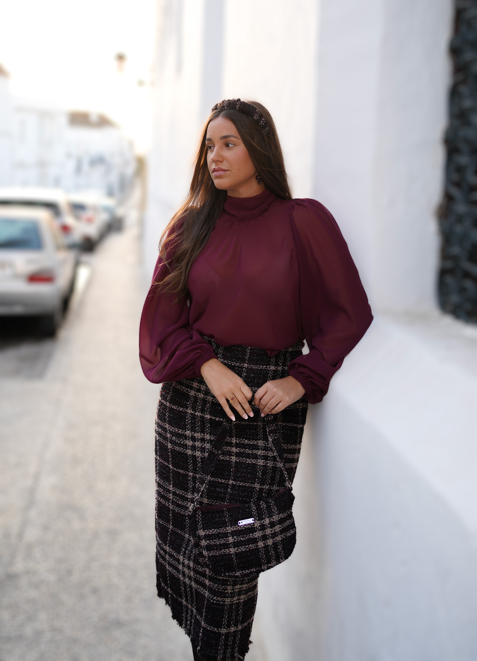 Confeccionada en un tejido tweed de altísima calidad, su textura con sutiles destellos eleva cualquier look. El diseño incorpora detalles en berenjena y beige, que contrastan delicadamente sobre la base negra con brillo, creando una falda única y con presencia.