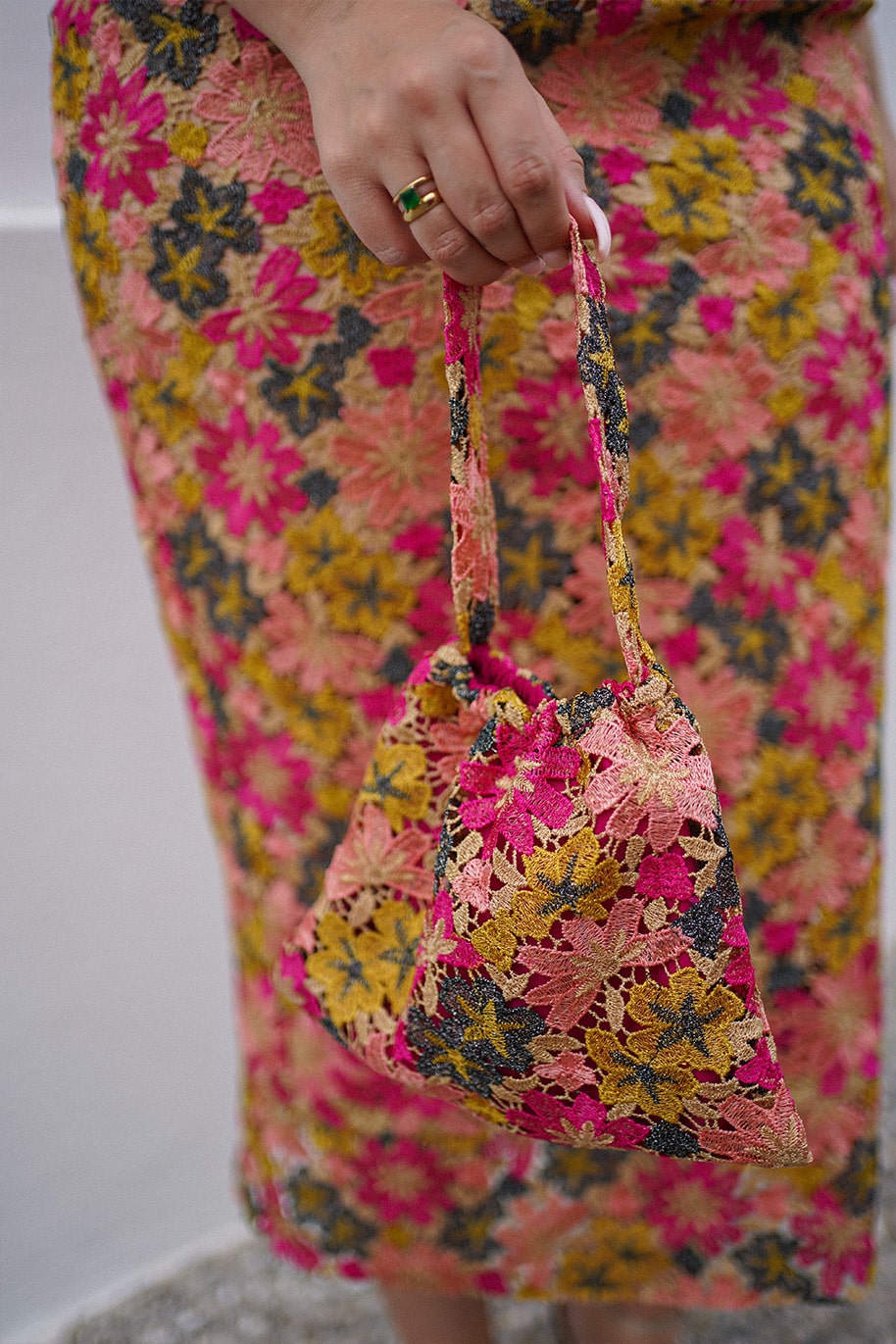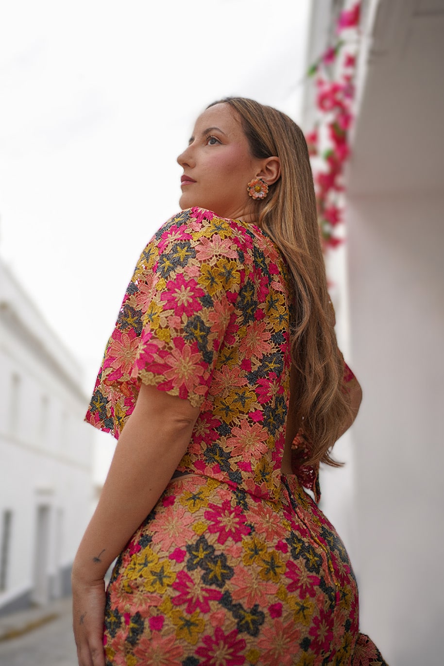 Su diseño destaca por un delicado guipur en tonos pistacho, rosa, coral y gris piedra, con un sutil hilo dorado que aporta pequeños destellos al sol. Una combinación única que crea una armonía cálida y sofisticada, elevando cualquier look con elegancia.