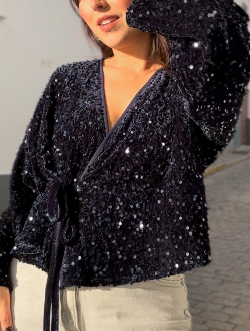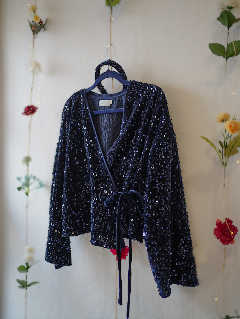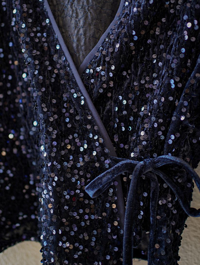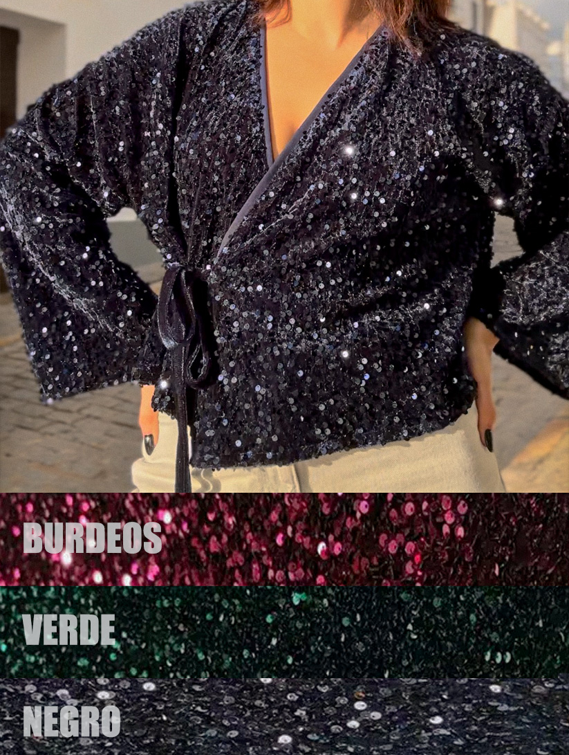 Confeccionado en nuestro taller artesanalmente, este kimono está creado en lentejuela fluida y ligera, con un interior de terciopelo para que sea cómodo y abrigado incluso en contacto con la piel. Es esa prenda que no solo brilla: te hace brillar a ti.