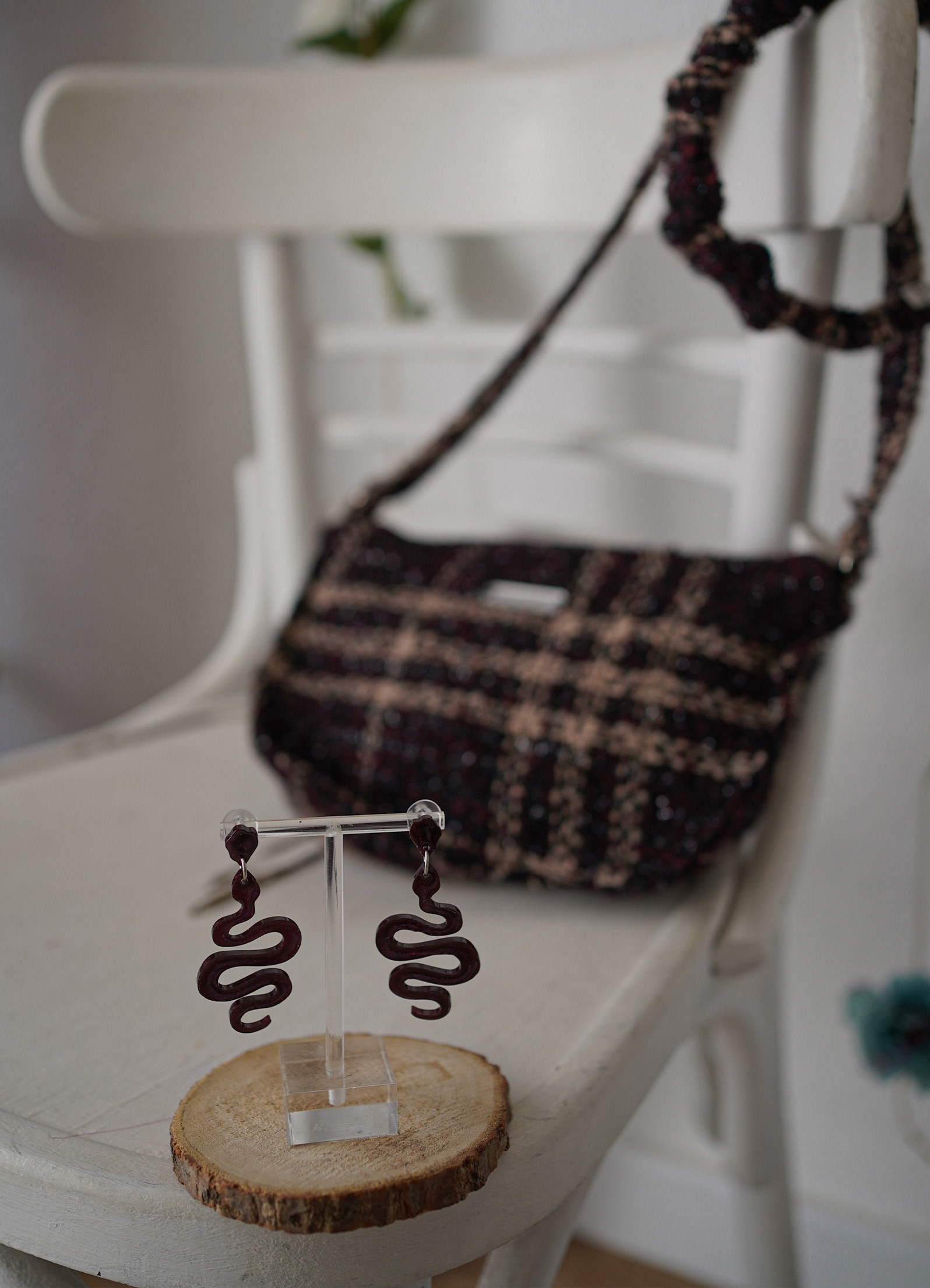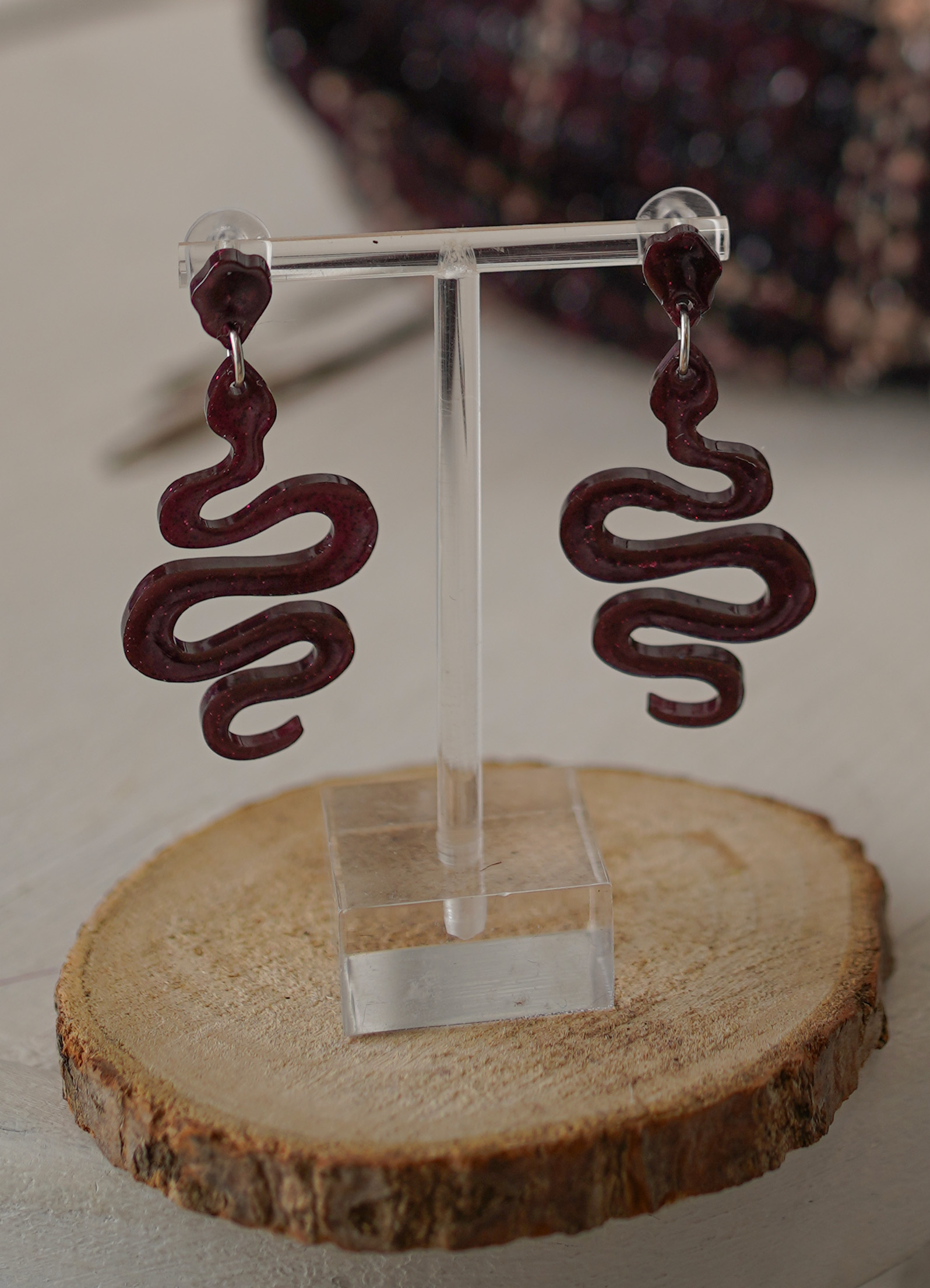 Diseño artesanal con carácter, pensado para dar un toque único y especial a tu look. En la imagen, aparece en un elegante tono berenjena oscuro con purpurina, inspirado en la fuerza y misterio de la colección Aspis.