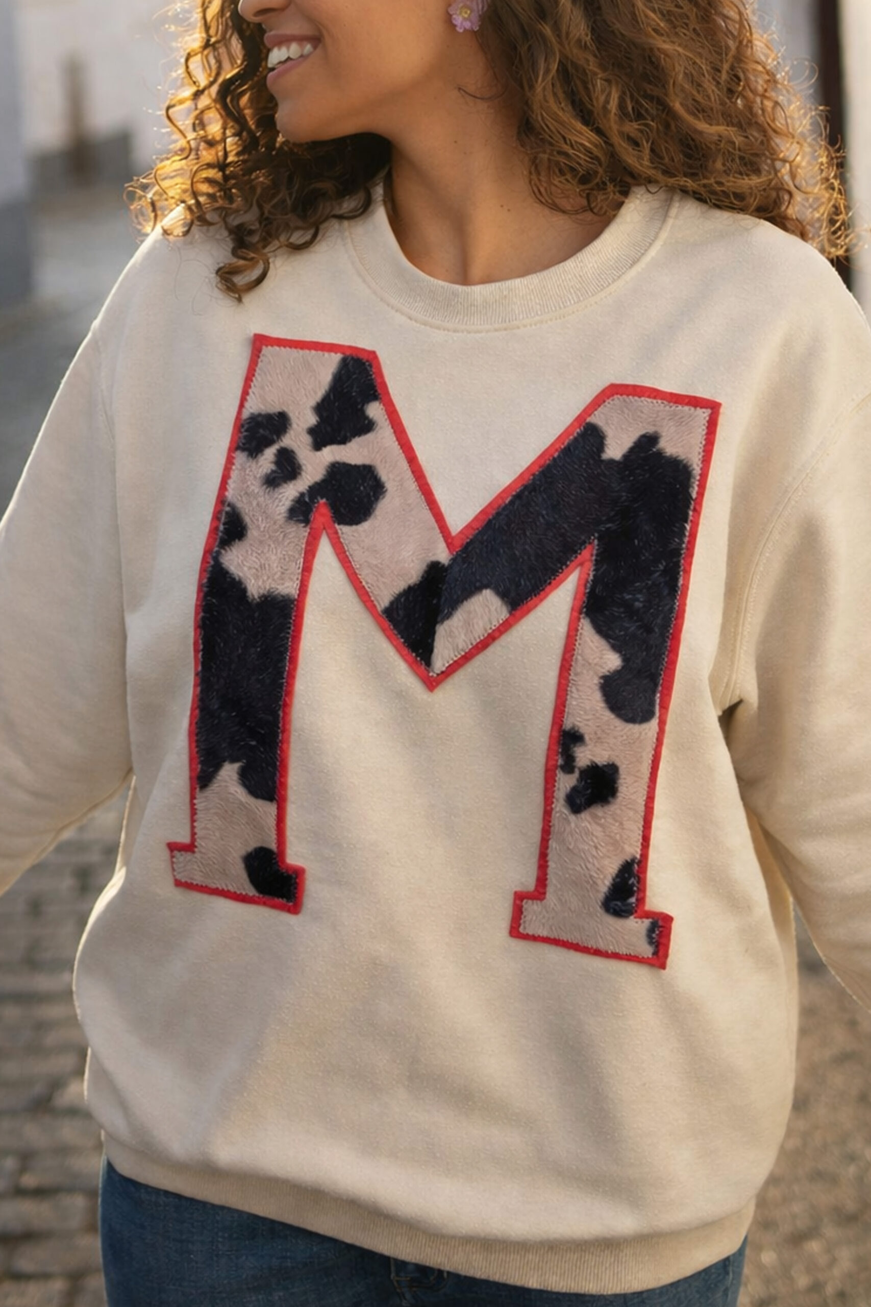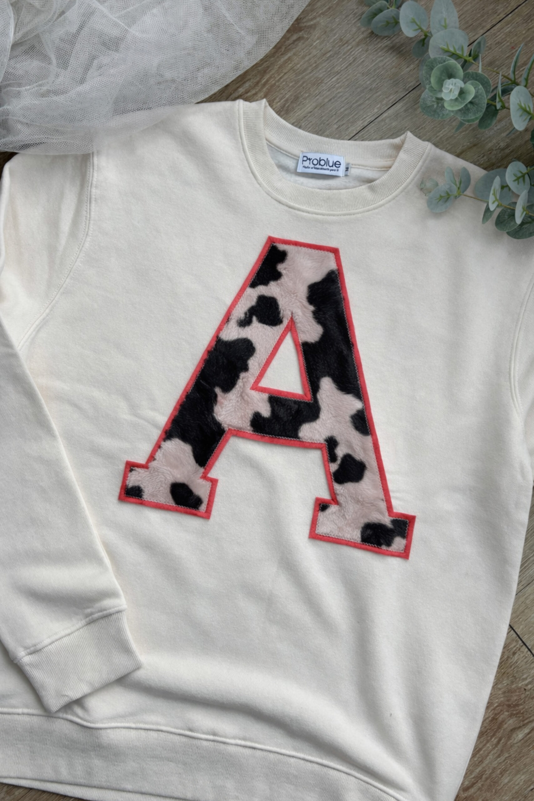 ¡Una sudadera que arrasa! Base en color crudo súper combinable, con estampado de vaca y detalle coral que le da un toque especial.