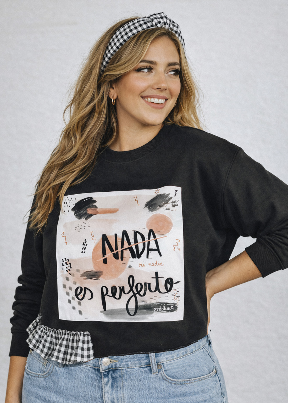 Base negra y estampado frontal con nuestro lema: «nada ni nadie es perfecto».