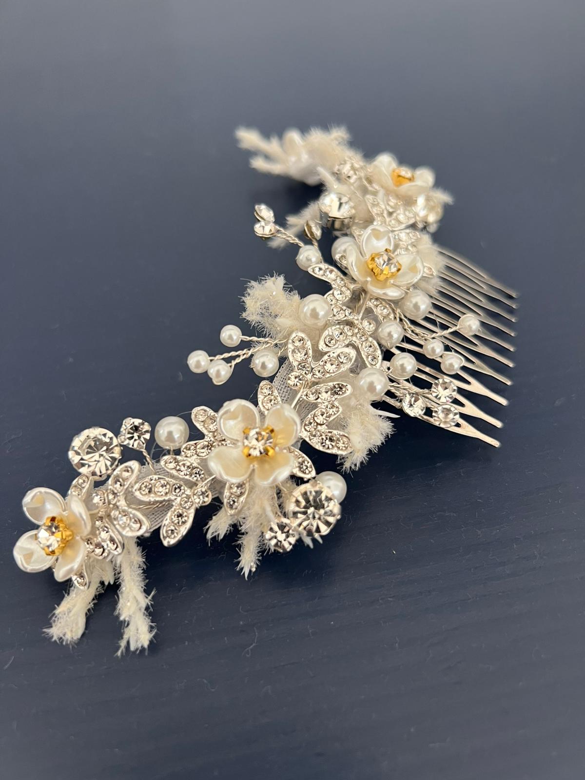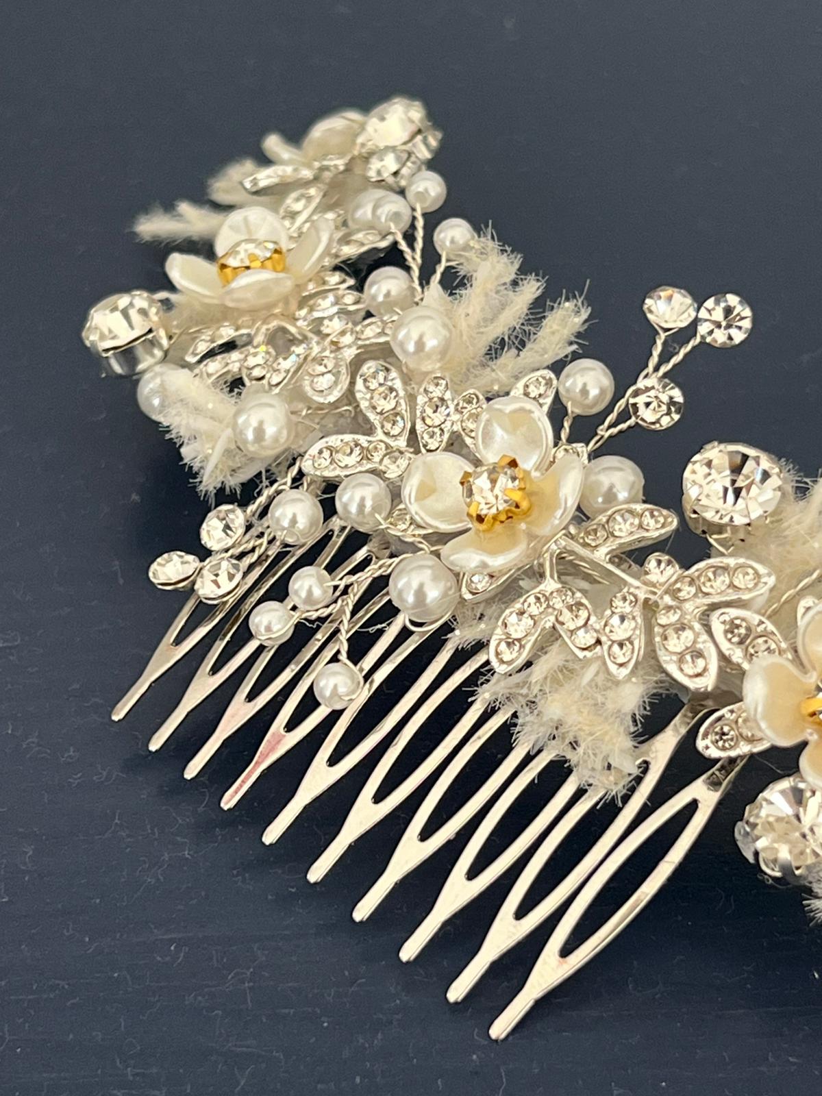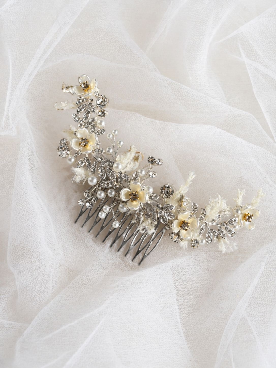 Diseñado en una armoniosa combinación de tonos blanco natural, perlado y plata, transmite una belleza sutil con un aire romántico y atemporal. Cada detalle ha sido cuidadosamente seleccionado: flores esmaltadas, perlas, cristales y finos elementos en plata que aportan luz y elegancia sin resultar recargado ✨