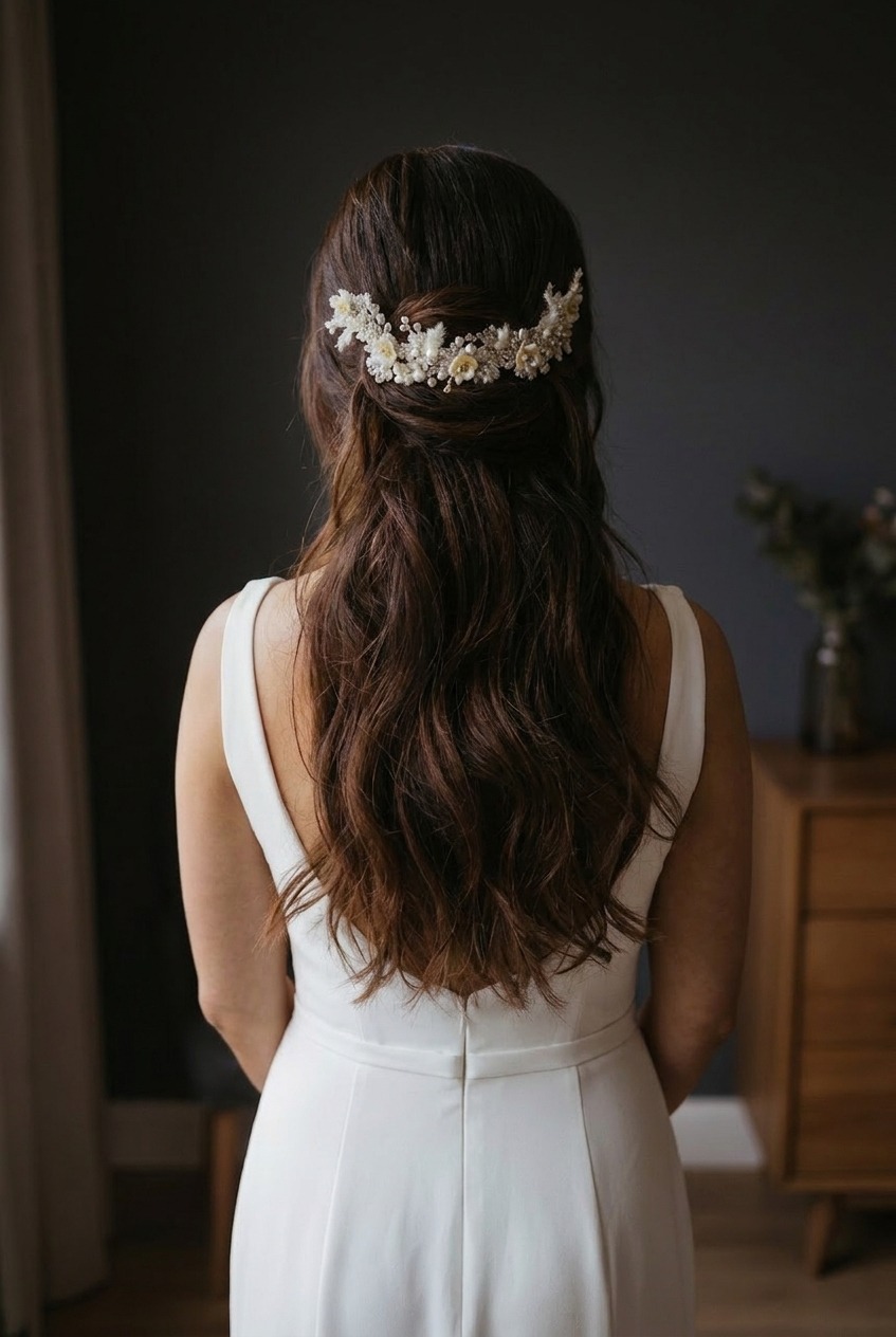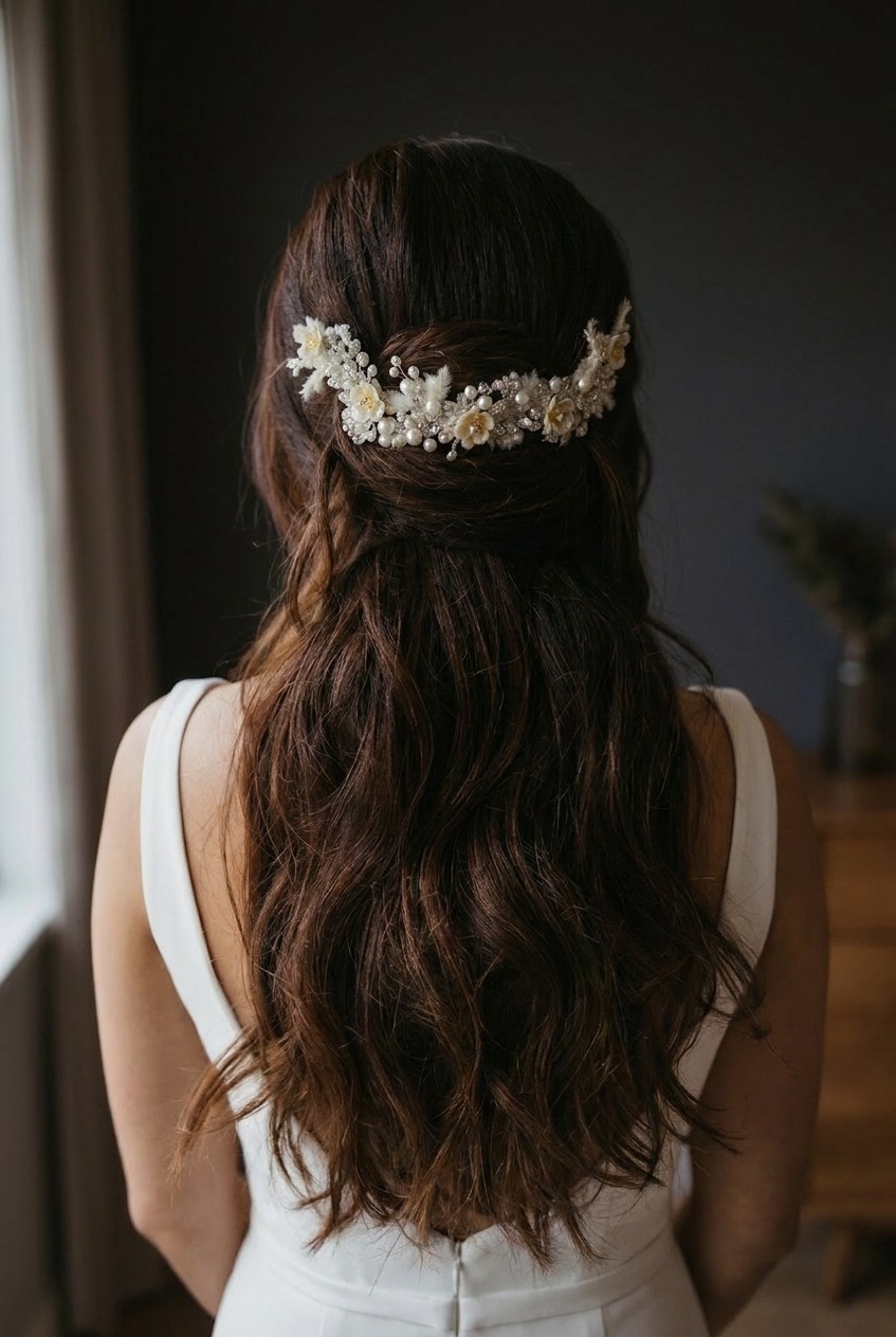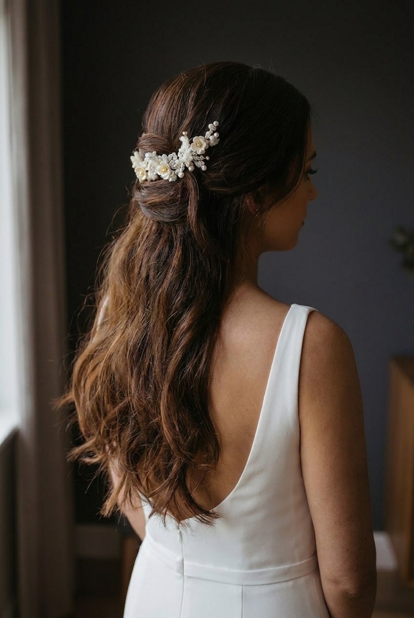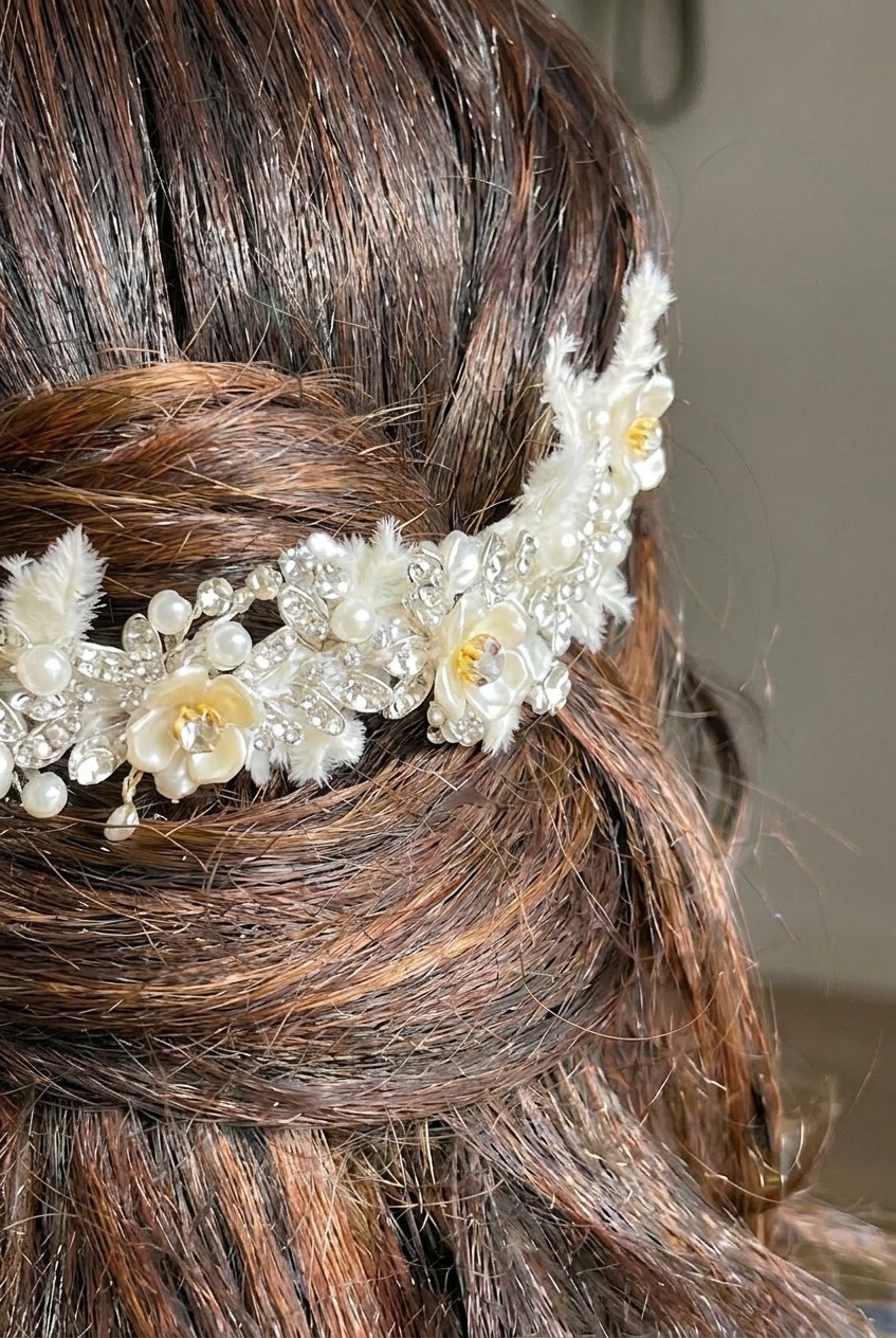 Se adapta con facilidad a distintos peinados: desde semirrecogidos con un acabado natural, hasta recogidos completos o colocado de forma lateral para enmarcar el rostro con delicadeza. Su estructura flexible permite integrarlo cómodamente en diferentes estilos y volúmenes de cabello 💙