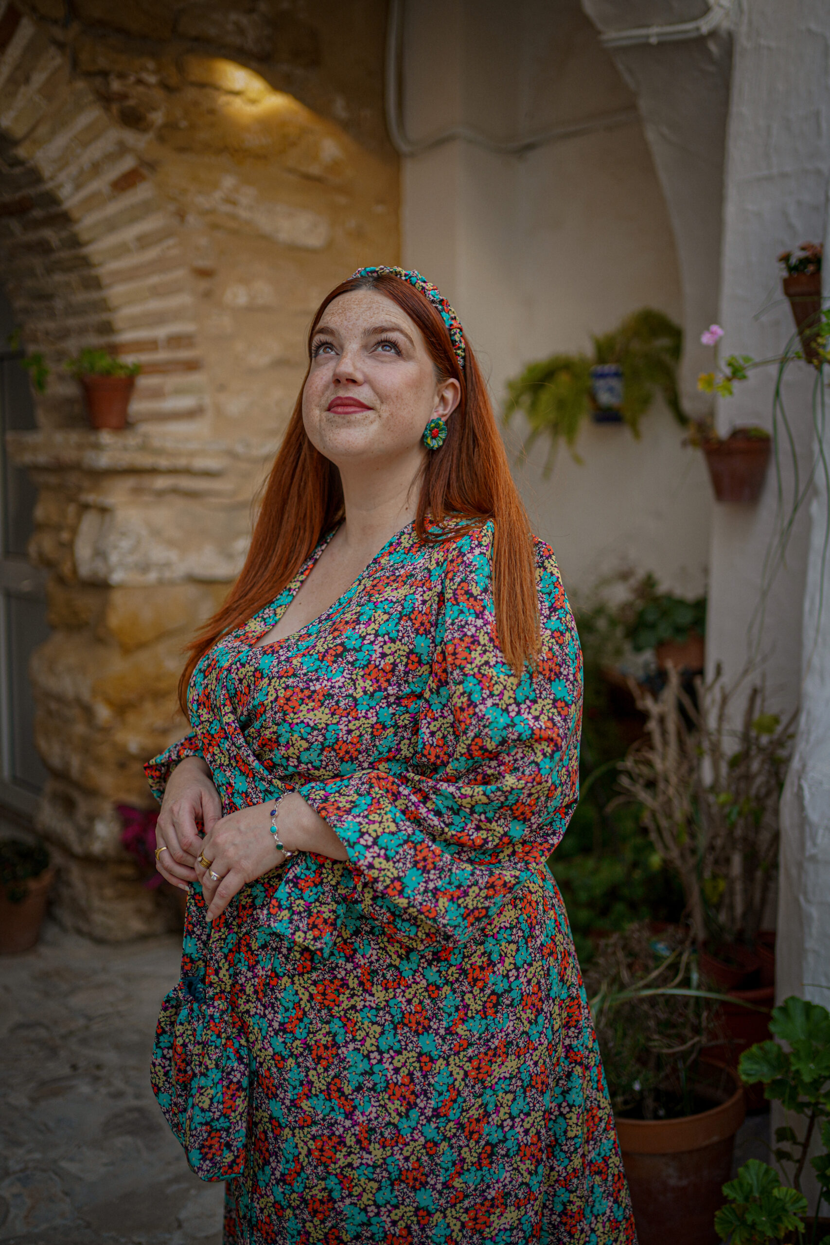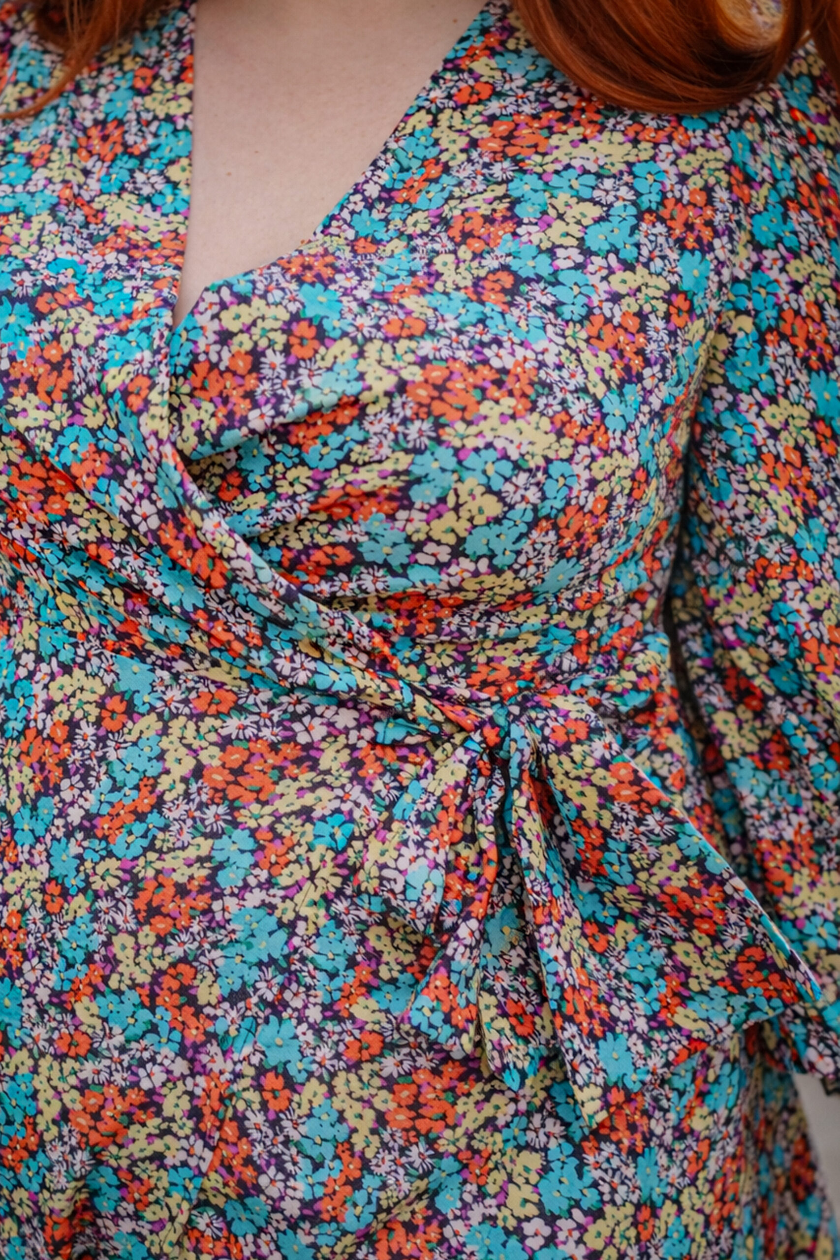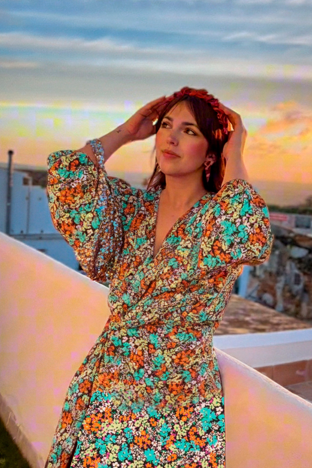 Vestido Flora confeccionado en crepe estampado en tonos anaranjados, turquesas, amarillo pastel… con un corte cruzado súper favorecedor que se adapta genial al cuerpo.