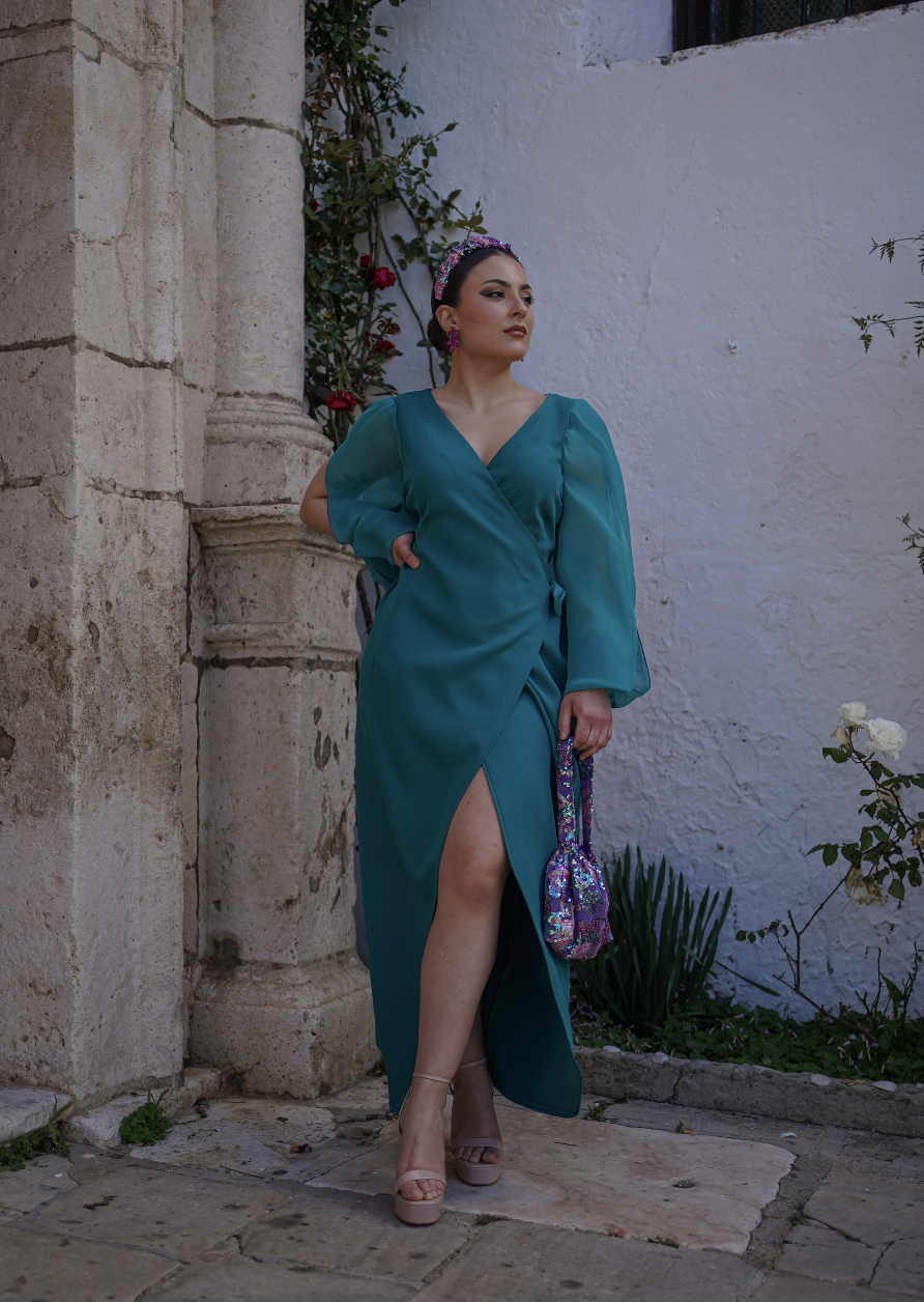 El vestido Mulán está inspirado en la estética japonesa, con una silueta tipo kimono que realza la figura con elegancia. Su diseño cruzado se ajusta mediante dos lazos, uno interior y otro exterior, lo que permite adaptar la talla a tu cuerpo de forma cómoda y favorecedora.